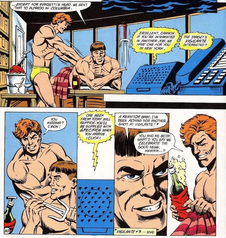 Cannon and Saber’s next appearance a couple years later, after Paul Kupperberg took over as writer, was more blatant. In #35, Cannon and Saber are shown in a beach house in Malibu; Saber, dressed in tiny yellow shorts, is giving a mostly nude Cannon a massage. After they accept an assignment to kill Vigilante, Saber suggests they celebrate, lifting up Cannon’s towel and leering. (The attempted hit, which goes down in Vigilante Annual #2, is not successful; Vigilante shoots Saber, and Cannon abandons the mission to get his lover to a doctor.)