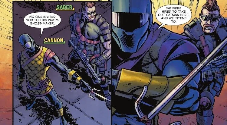 Instead, Cannon and Saber vanished almost entirely. They appeared exactly three times in the early 2000s, showing up in large groups of supervillains without any lines (but always together). Their next significant appearance wasn’t until DC’s 2023 Pride special, in which they fought antiheroes Catman and Ghost-Maker. The story doesn’t even make it clear that Cannon and Saber are a) queer or b) a couple for the benefit of everyone who missed two random issues of Vigilante in the 80s. However, at least Saber now also has absolutely atrocious hair? Maybe that’s their couple thing.