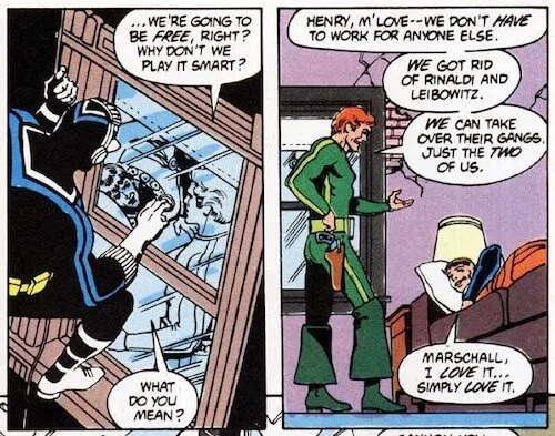This is probably the most risque queer content I’ve seen in a pre-1989 Code update comic outside of all that BDSM Wonder Woman was doing in the 1940s. [Vigilante #35 (November 1986), art by Chuck Patton and Rick Magyar.]